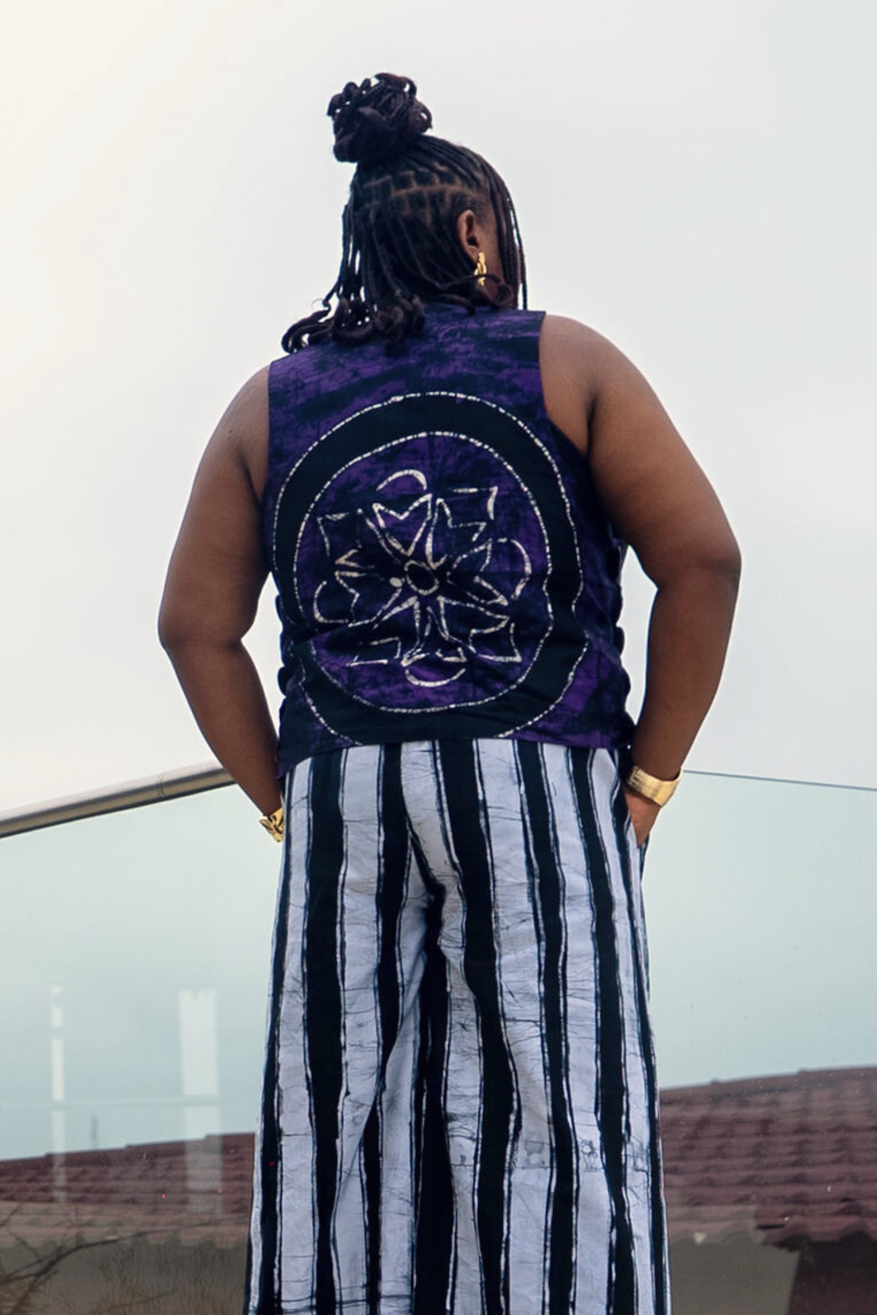 Crafted with Wax-Resist Dyed Funtua Fabric.