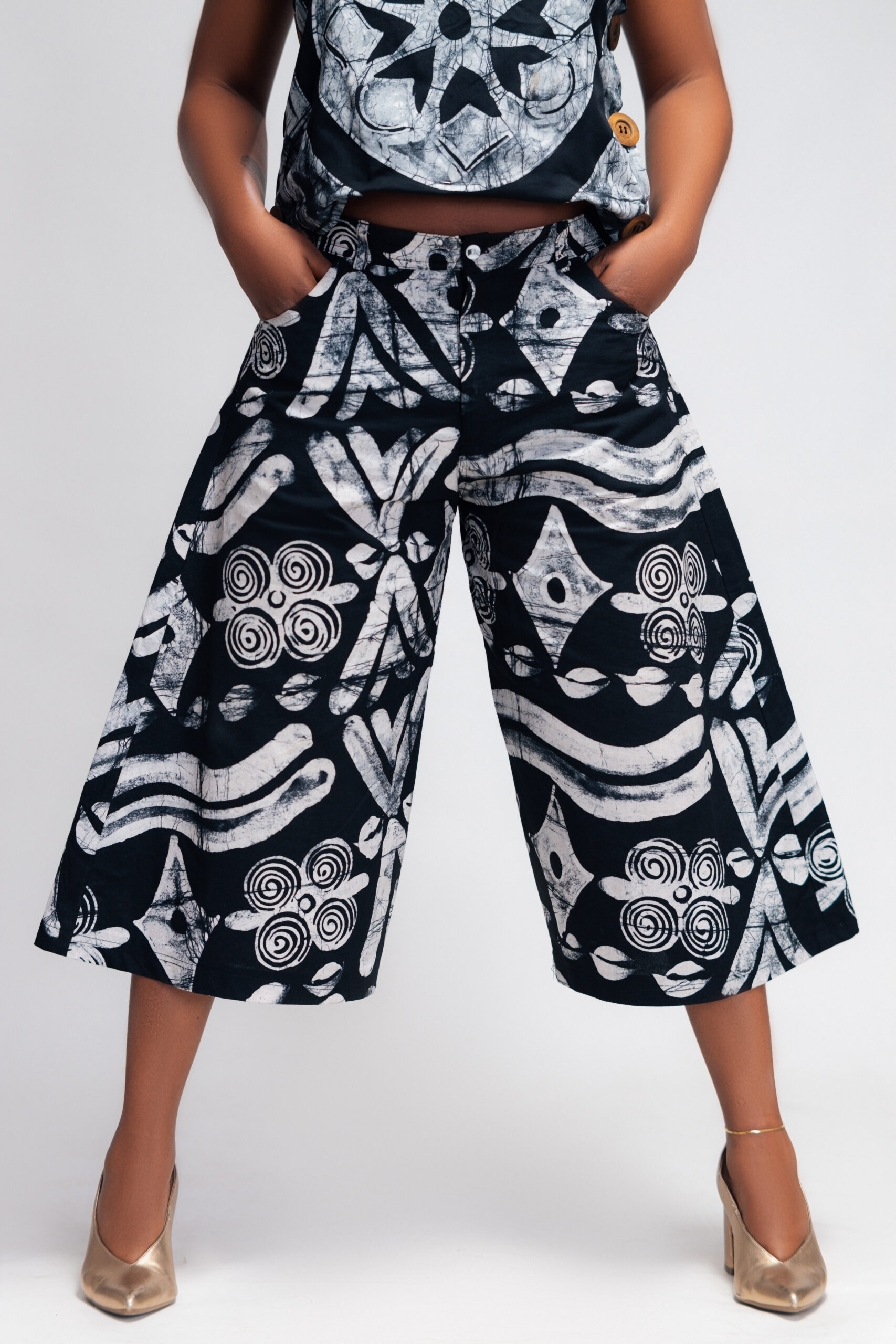 Crafted from wax-resist dyed calico cotton, these capris are a statement of heritage and contemporary design. The relaxed, baggy silhouette ensures effortless movement, offering both comfort and style. Designed for versatility, they can be dressed up or down, making them an essential piece for the modern, conscious wearer.